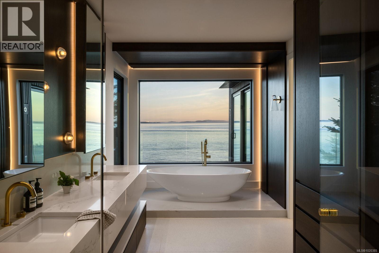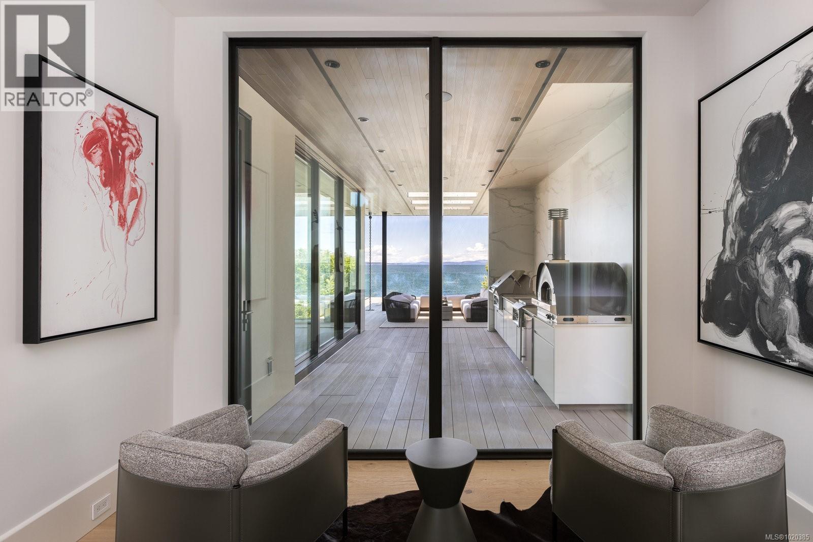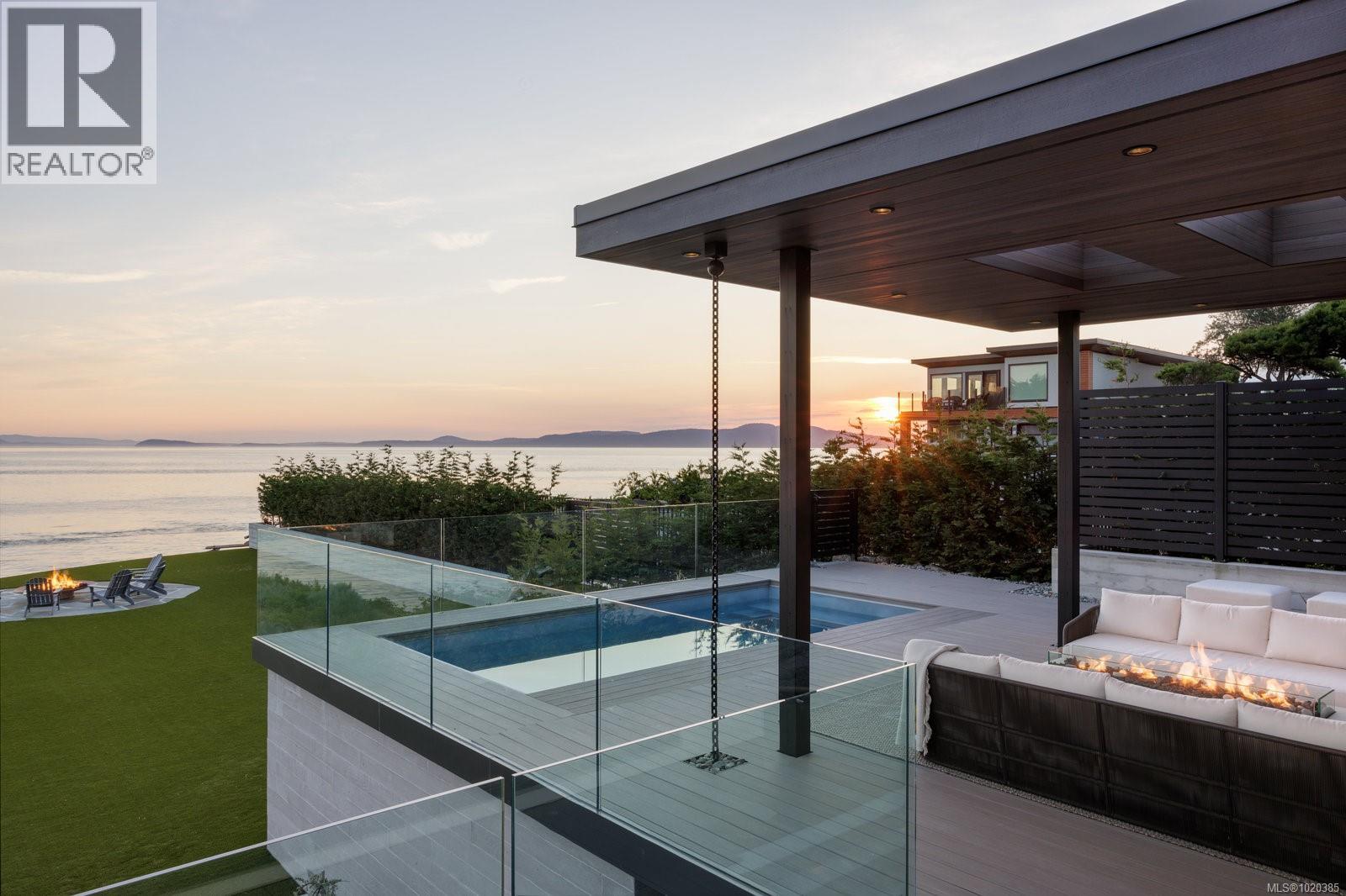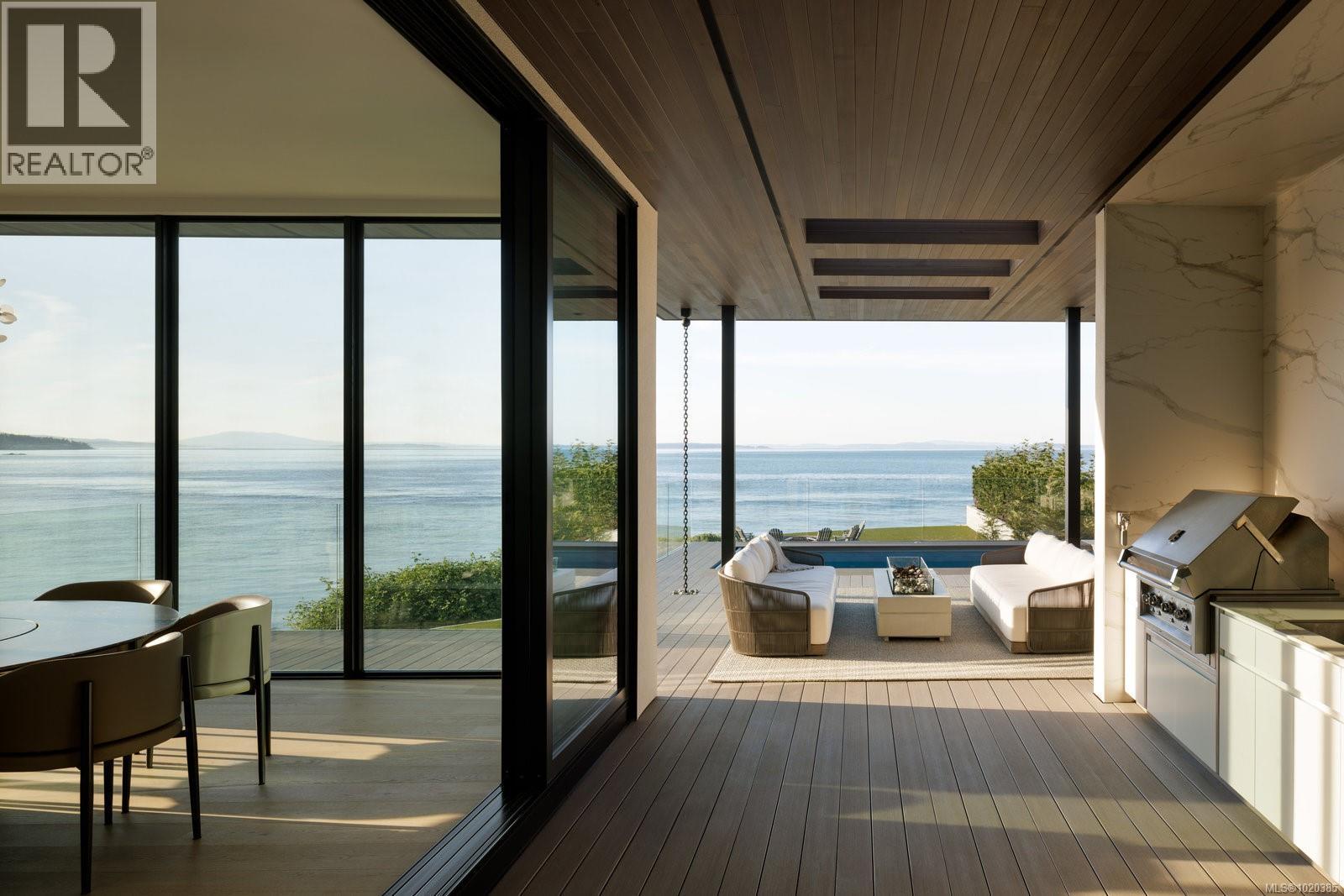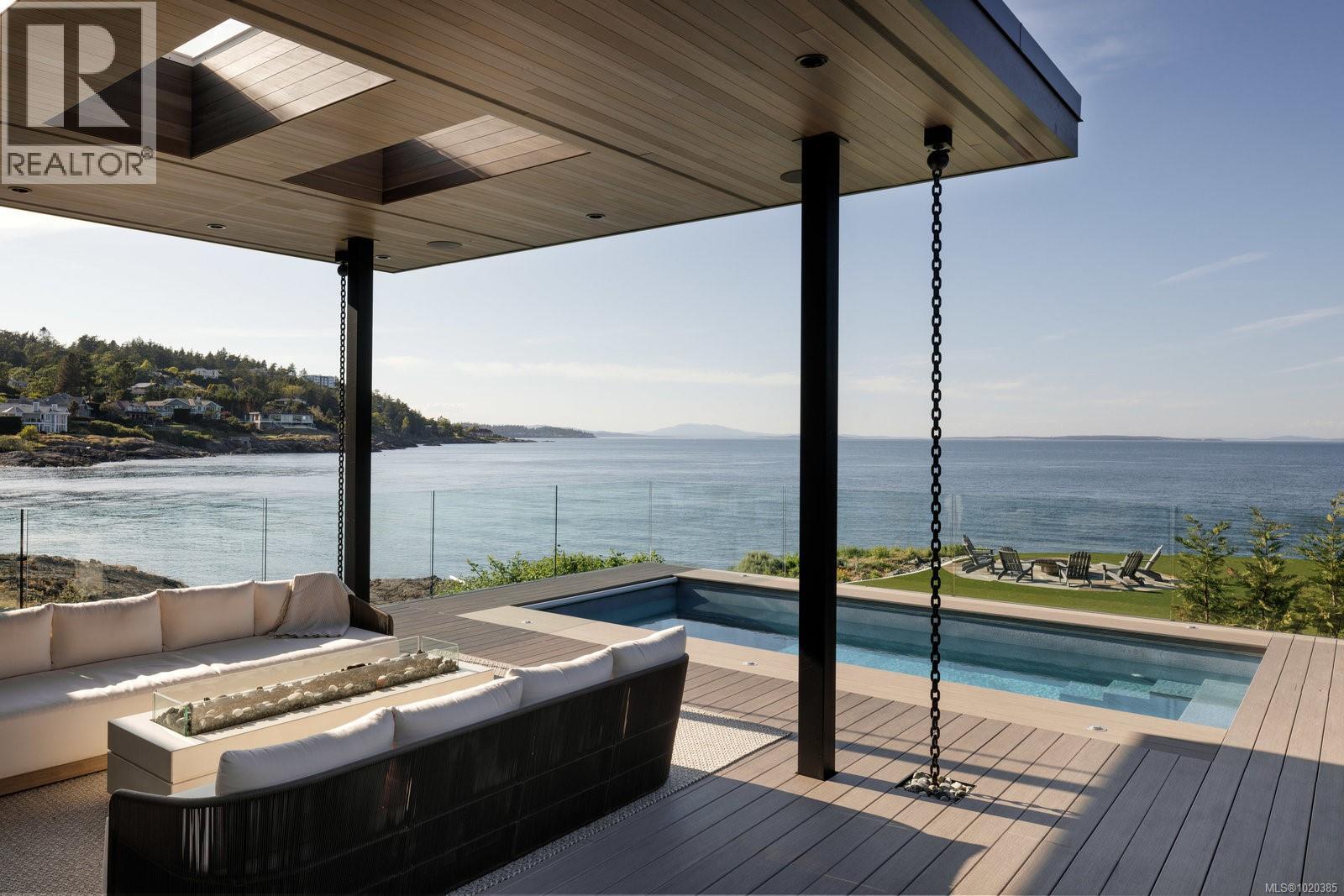 Experience Unparalleled Luxury at Vista del Mare. Perfectly positioned on over half an acre of prime waterfront in the prestigious Ten Mile Point, this architectural masterpiece by Robert Blaney, brought to life by Terry Johal Developments, promises to leave you breathless. Winner of 4 CARE Awards, including Best Single Family Detached Home, Best Innovative Feature, Best Primary Suite and Best Custom Millwork. Step into grandeur with 10-foot ceilings and a show-stopping steel and white oak floating spiral staircase that sets the tone for the rest of this captivating home. The expansive floor-to-ceiling windows on all three levels not only flood the interior with natural light but also offer uninterrupted views of Haro Strait and San Juan Island, making every room a visual delight. The neutral colour palette, accented by targeted designer lighting, creates an ambiance that is both clean and invigorating. The main floor's open-plan design maximizes these ocean views, seamlessly integrating the living, dining, and kitchen areas for effortless entertaining and everyday living. The sky-lit covered patio, adjacent to your complete outdoor kitchen with a deluxe Hestan grill and Fontana Forni pizza oven - imported from Italy- allows for al fresco dining with the backdrop of stunning seascapes, with the occasional killer whale and aurora borealis sighting. Enjoy a dip in the heated pool, followed by a rinse in the outdoor shower. Car enthusiasts will appreciate the attached three-car garage, equipped with two vehicle elevators. Above the garage, a separate, well-insulated guest suite offers a private living area, bedroom, and full bath. (id:2469)