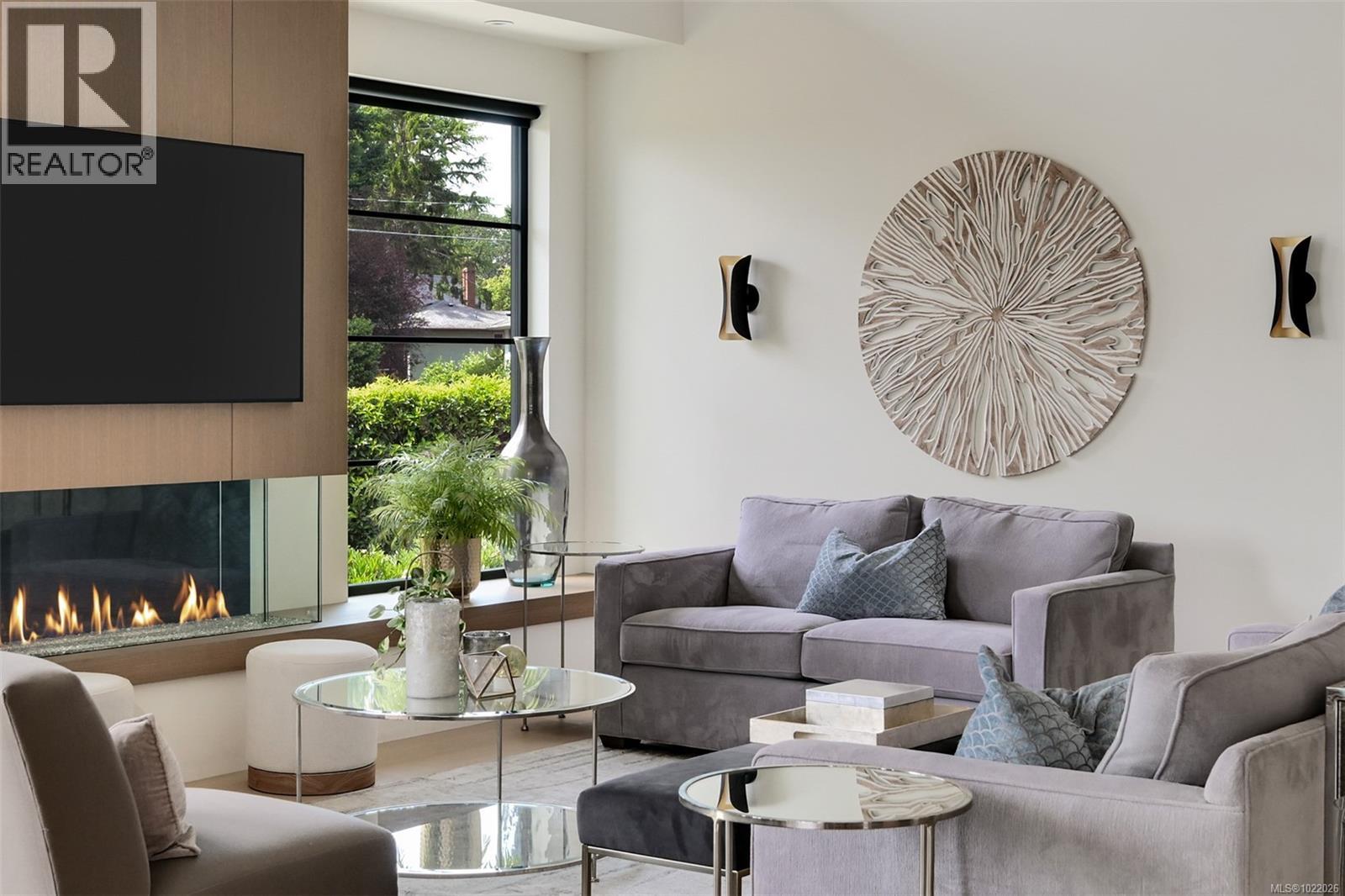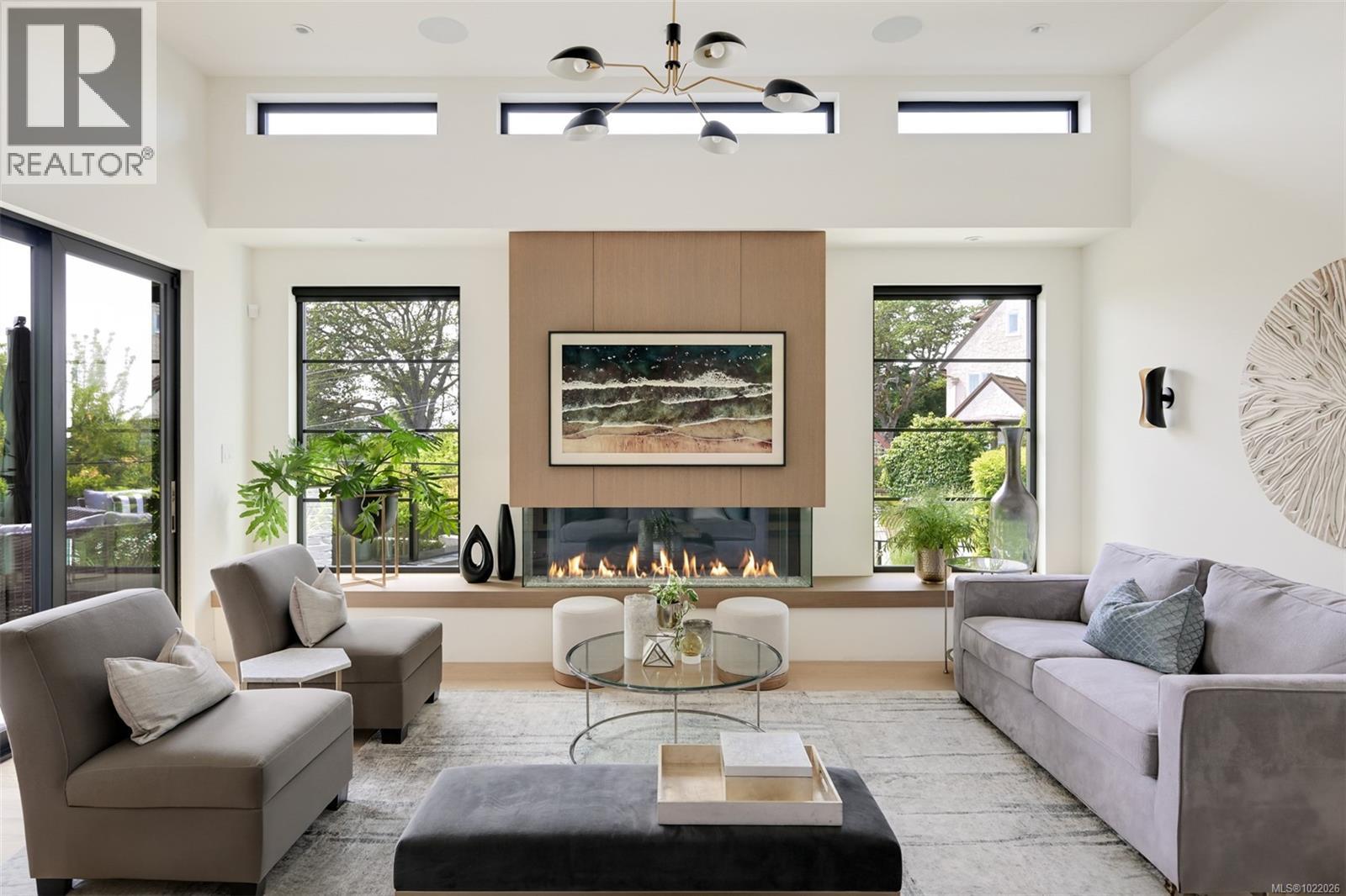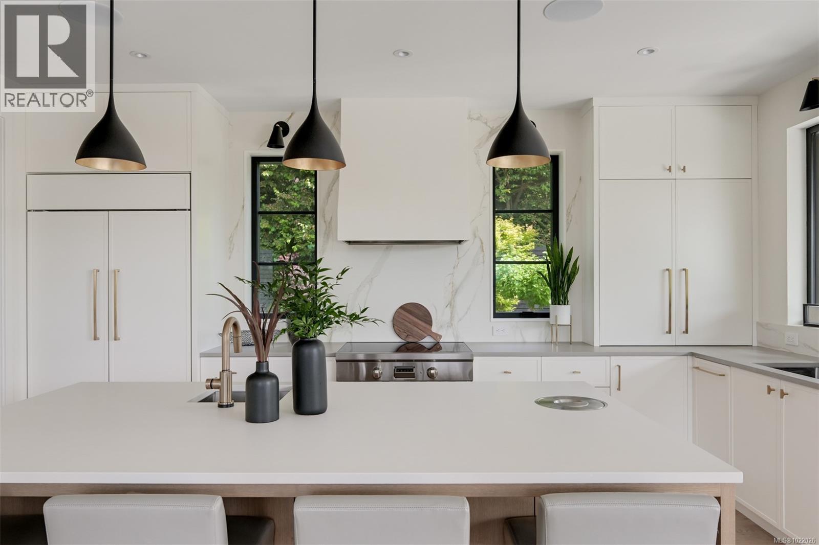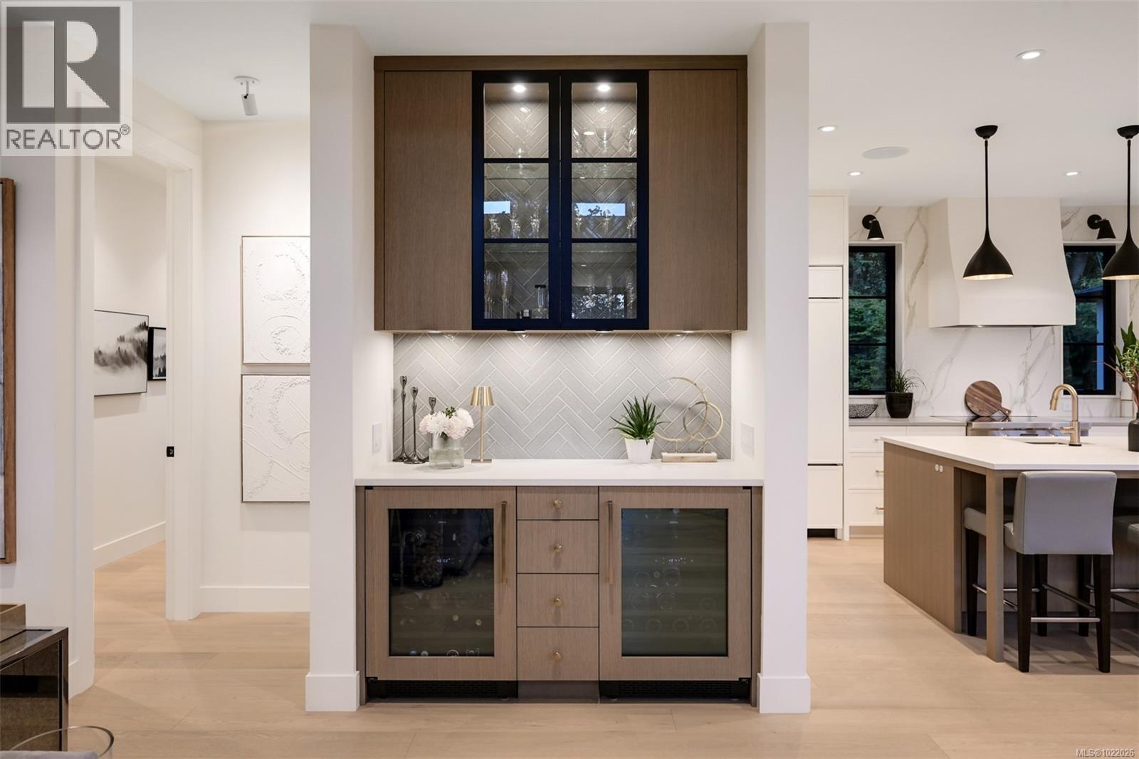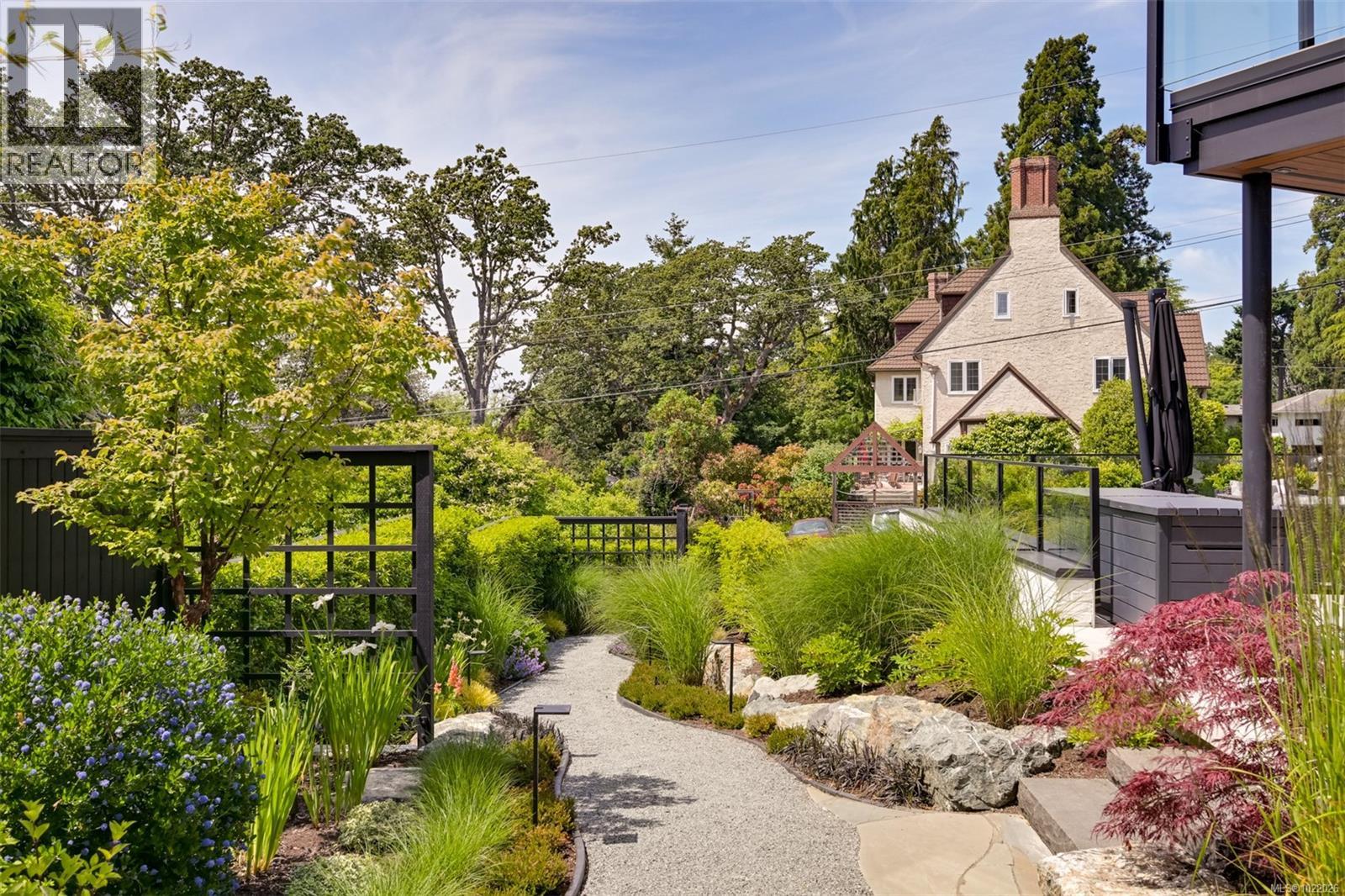 Architectural Sophistication in Prestigious Rockland Positioned in the heart of historic Rockland in a park-like setting, this 4,500 sq. ft. custom-built residence is a masterclass in contemporary design & refined craftsmanship. Built by Coast Prestige Homes & designed by Robert Blaney Design, this 5-bed, 5-bath home blends timeless luxury w/modern livability in one of Victoria’s most desirable neighbourhoods. Set on a beautifully landscaped property, the home makes a bold first impression w/its clean architectural lines & surrounding greenery. Inside, expansive windows flood the interiors w/light, enhancing the home's airy flow & sophisticated aesthetic. A striking gas fireplace anchors the main living area, where elegance meets everyday comfort. The gourmet kitchen is a chef’s dream, featuring a large central island, panel-ready Sub-Zero fridge, Wolf range, Miele steam oven & built-in coffee system, three sinks, dual Bosch dishwashers & a spacious walk-in pantry. A custom banquette dining area & adjacent bar —complete w/dual beverage fridges—elevate the entertaining experience. Seamlessly connected to the kitchen, a covered outdoor terrace offers year-round enjoyment w/patio heaters, lighting, integrated audio, plumbed gas for fire feature & BBQ & more. The fenced private yard includes beautiful gardens, architectural hardscaping, raised garden beds & a custom shed mirroring the home’s aesthetic. Upstairs, the primary suite is a luxurious sanctuary featuring ocean views, a private balcony, spa-inspired ensuite w/freestanding soaker tub, double rain shower, dual vanities, & his-and-hers dressing rooms. Two additional bedrooms, a designer bathroom, & a stylish laundry room complete the upper level. The lower level offers incredible versatility w/a flex room, gym, family room, full bath, & a custom mudroom w/direct access to the oversized double garage. A rare opportunity to own a custom residence of this caliber in an iconic Victoria location. (id:2469)